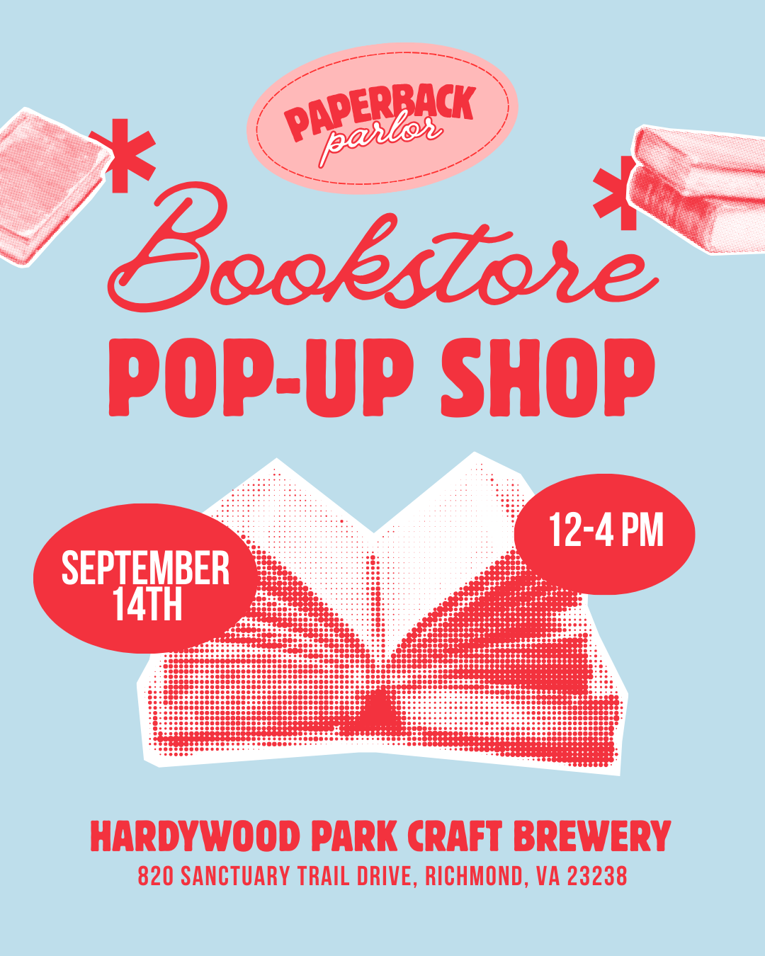 Join us for our very first pop-up bookstore on Sunday, September 14th, from 12–4 PM at Hardywood Park Craft Brewery – West Creek.